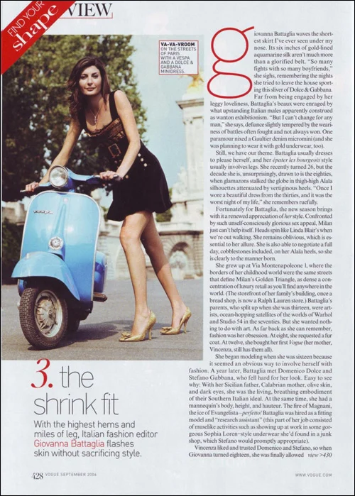 Giovanna Battaglia waves the shortest skirt I’ve ever seen under my nose. Its six inches of gold-lined aquamarine silk aren’t much more than a glorified belt. “So many fights with so many boyfriends,” she sighs, remembering the nights she tried to leave the house sporting this sliver of Dolce & Gabbana.